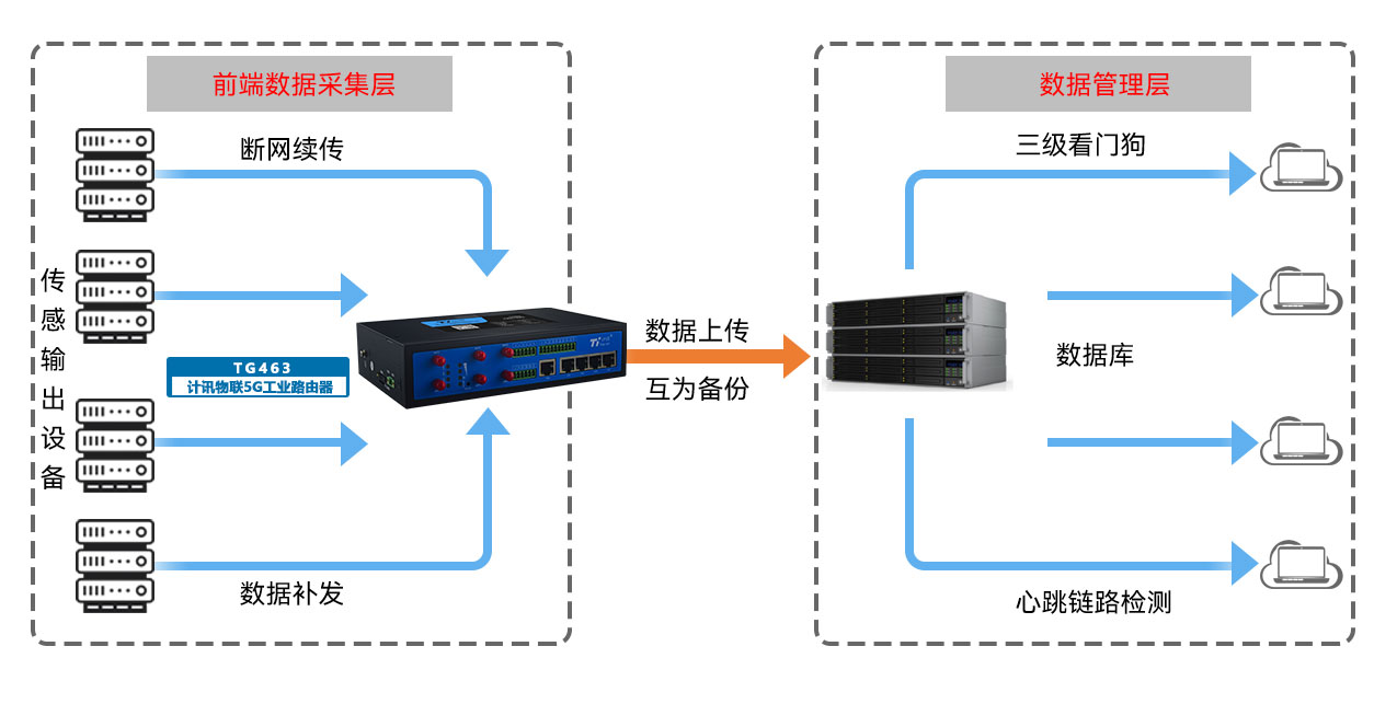 支持斷電、斷網續(xù)傳和數(shù)據自動補發(fā),保證數(shù)據完整性;有線、無線網絡互為備份,降低通信故障概率;三級看門狗機制、心跳鏈路監(jiān)測保護,保障數(shù)據穩(wěn)定完整傳輸。