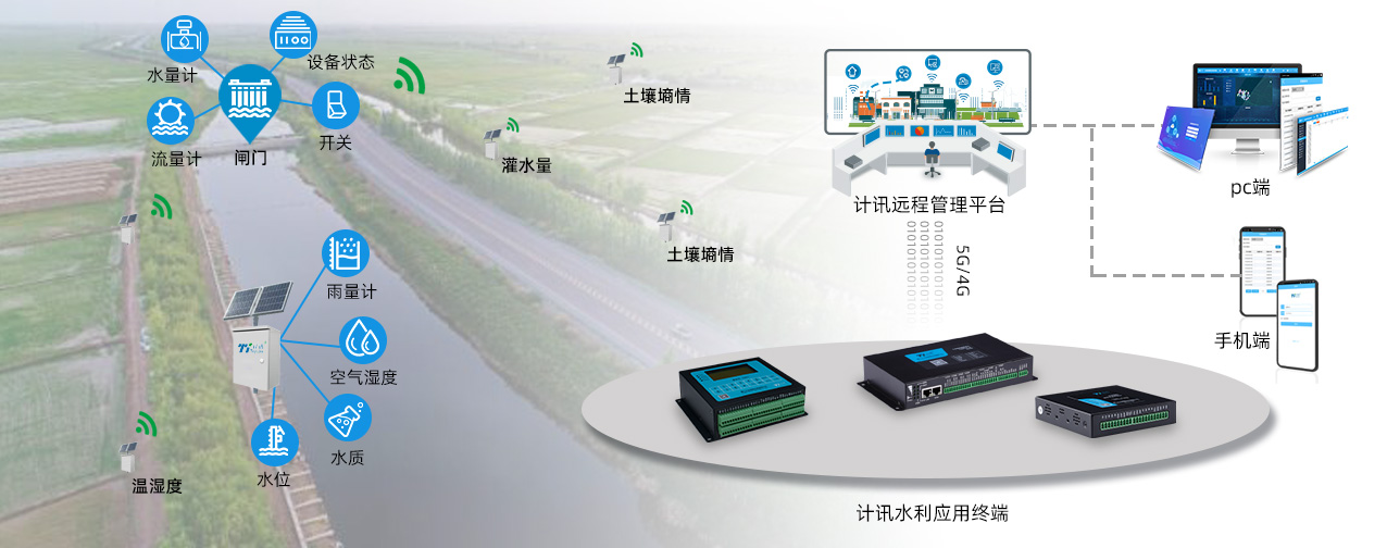 遙測(cè)終端機(jī)作為核心建立通信通道,下行對(duì)接監(jiān)測(cè)點(diǎn)各類傳感器、控制終端、視頻圖像終端,模擬量、開關(guān)信號(hào)量、視頻圖像實(shí)時(shí)采集,存儲(chǔ)、分析、處理,計(jì)訊物聯(lián)水利遙測(cè)終端機(jī)運(yùn)用全網(wǎng)通5G/4G、北斗、GPRS等上傳服務(wù)器。上行對(duì)接控制中心,數(shù)據(jù)展示,傳力研判,可視化圖表準(zhǔn)確趨勢(shì)預(yù)判,監(jiān)測(cè)點(diǎn)狀態(tài)24小時(shí)實(shí)時(shí)監(jiān)控,精準(zhǔn)掌握水情、雨情、灌溉工況、土壤墑情、氣象環(huán)境等綜合情況,設(shè)備遠(yuǎn)程控制、配置、運(yùn)維,以達(dá)到科學(xué)種植、灌區(qū)信息化管理的終極目標(biāo)。