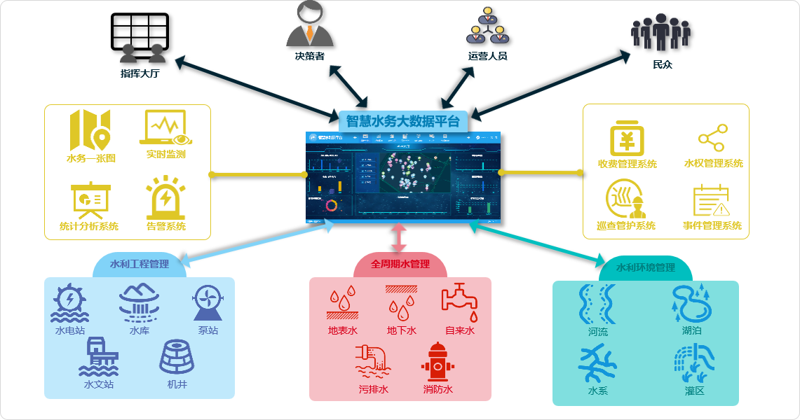 水務(wù)管理參與人員(決策者、運營人員、用戶大眾),通過智慧水務(wù)平臺中監(jiān)測、分析、告警、收費、巡查、事件等功能模塊,實現(xiàn)對水資源、水務(wù)工程、水利環(huán)境的監(jiān)測、管理。