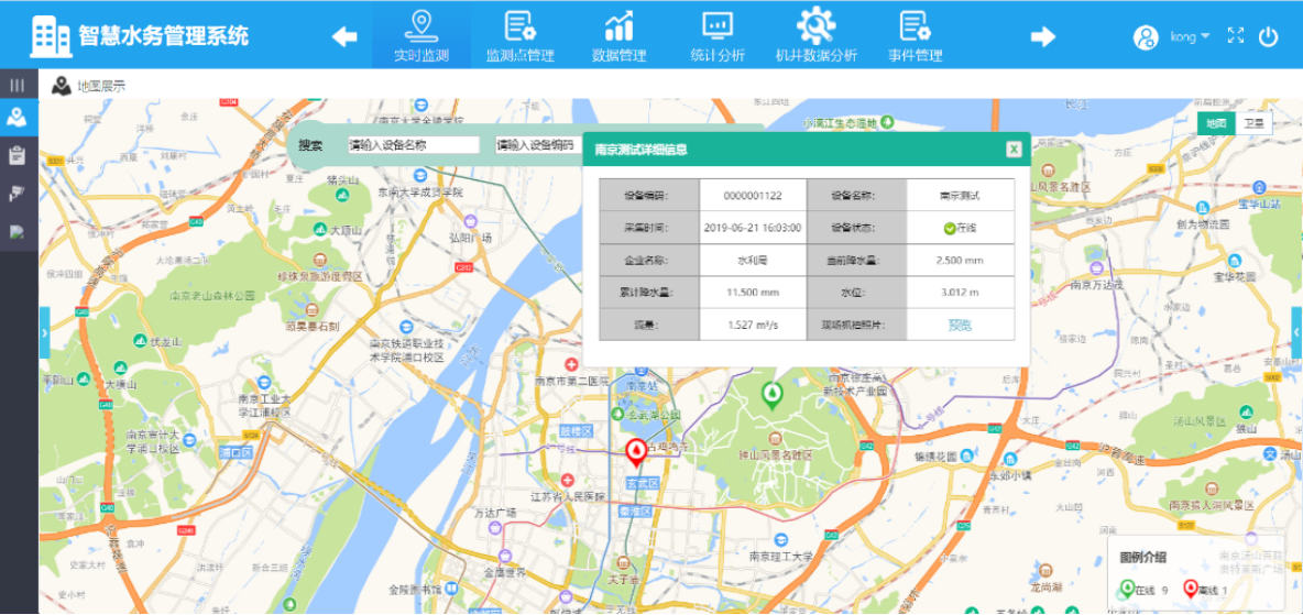 基于GIS地圖展現(xiàn)各監(jiān)測點空間分布情況、監(jiān)測點狀態(tài)、實時數(shù)據(jù),不同狀態(tài)的監(jiān)測點不同顏色標(biāo)注,實時播報告警信息。