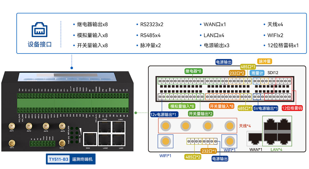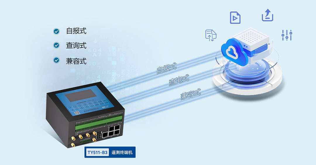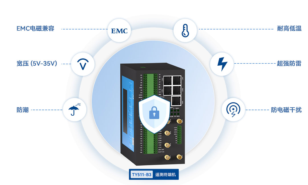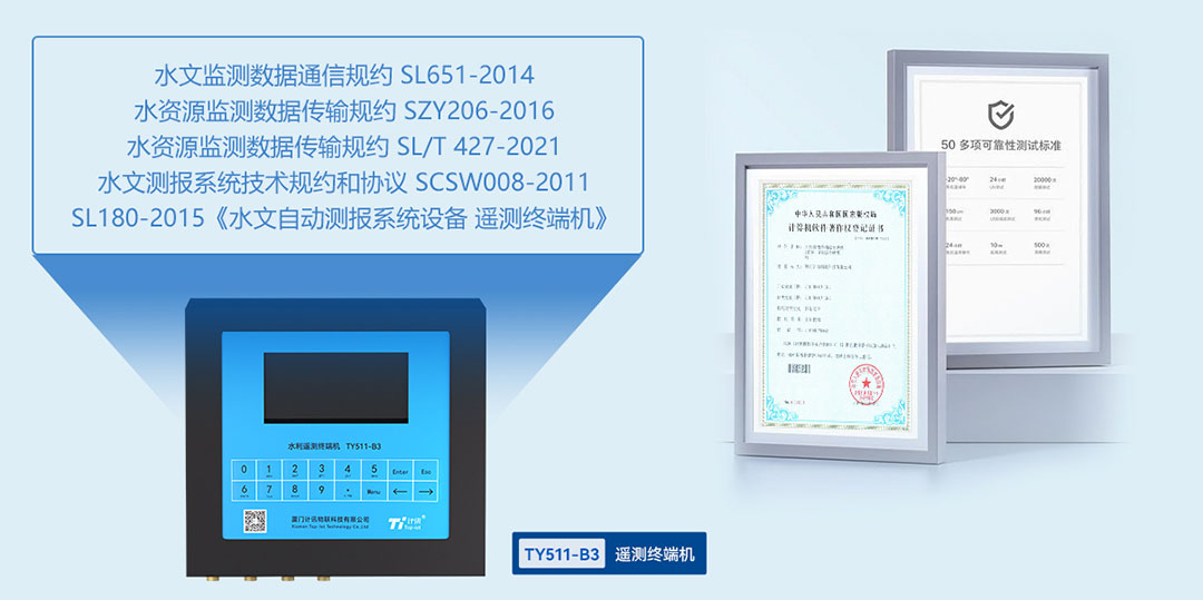 遙測(cè)終端RTU TY511-B3,全網(wǎng)通5G/4G、北斗通信,具備網(wǎng)口、模擬量輸入、開關(guān)量、多路RS232和RS485接口,集數(shù)據(jù)采集、傳輸、控制功能于一體的工業(yè)級(jí)遠(yuǎn)程測(cè)控終端,支持國(guó)家水文/水資源規(guī)約/HJ212、Json、Modbus TCP/Modbus RTU、MQTT協(xié)議等。