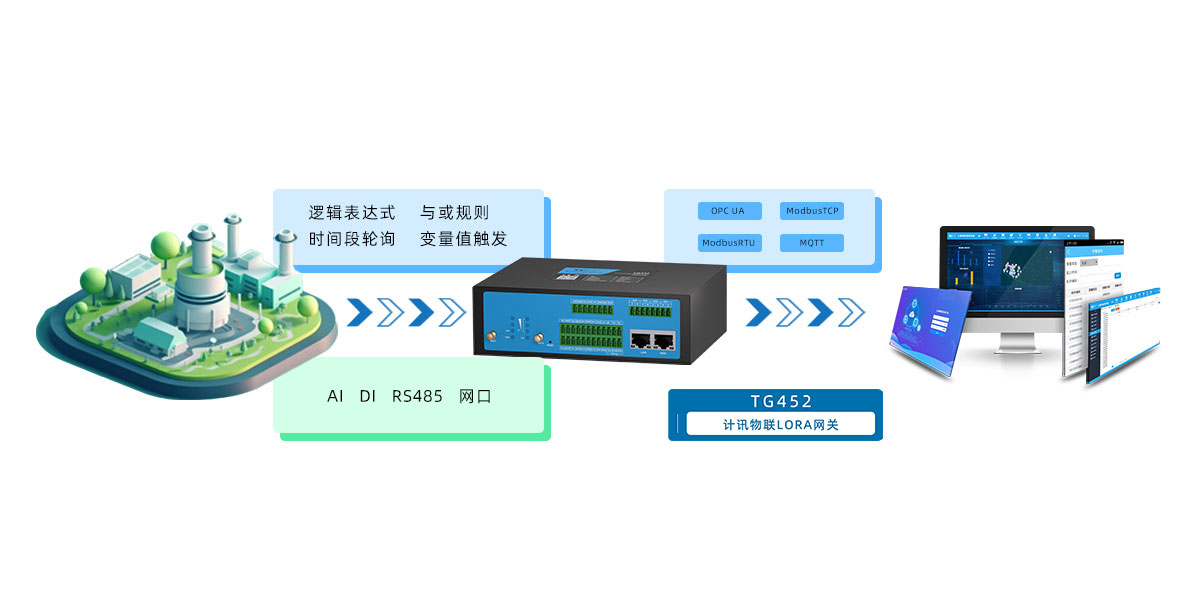 LORA網(wǎng)關(guān)TG452-A2,通過AI\DI\RS485\網(wǎng)口等信號(hào)源采集數(shù)據(jù),自定義組合算法(支持邏輯表達(dá)式、與或規(guī)則、時(shí)間段輪詢|變量值觸發(fā)等定義),靈活實(shí)現(xiàn)DO聯(lián)動(dòng)控制策略。豐富協(xié)議庫,支持OPC UA、ModbusTCP、modbusRtu、MQTT等協(xié)議,支持工業(yè)自動(dòng)化處理軟件KEPServerEX6,PLC數(shù)據(jù)采集、遠(yuǎn)程控制、遠(yuǎn)程配置升級(jí)。
