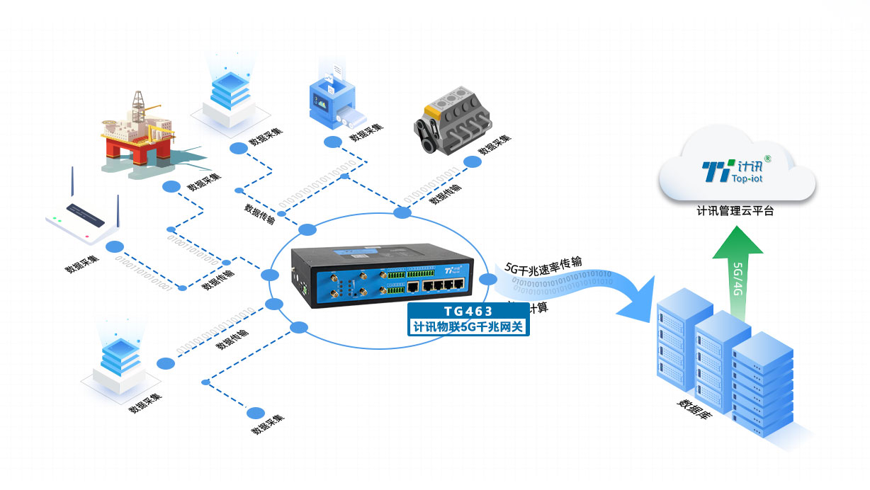 計訊物聯(lián)TG463 5G千兆網(wǎng)關(guān)集成了前端數(shù)據(jù)采集和5G千兆速率傳輸功能,提供模擬量/數(shù)字量/開關(guān)量等數(shù)據(jù)采集控制、支持視頻/圖像/語音采集。支持全網(wǎng)通/5G/4G/GPS/WiFi等無線通信。兼容各行業(yè)通信協(xié)議及行業(yè)規(guī)約,滿足各種工業(yè)應(yīng)用組網(wǎng)。