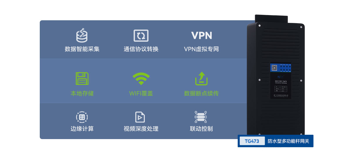 防水型智慧燈桿網(wǎng)關(guān)TG473集數(shù)據(jù)智能采集、通信協(xié)議轉(zhuǎn)換、VPN虛擬專(zhuān)網(wǎng)、本地存儲(chǔ)、WIFI覆蓋、數(shù)據(jù)斷點(diǎn)續(xù)傳等功能于一體,支持邊緣計(jì)算、邊緣存儲(chǔ)、邊緣控制、視頻深度處理、人臉識(shí)別、聯(lián)動(dòng)控制、多中心傳輸、集控管理、故障告警,為組網(wǎng)應(yīng)用提供全面選項(xiàng)。