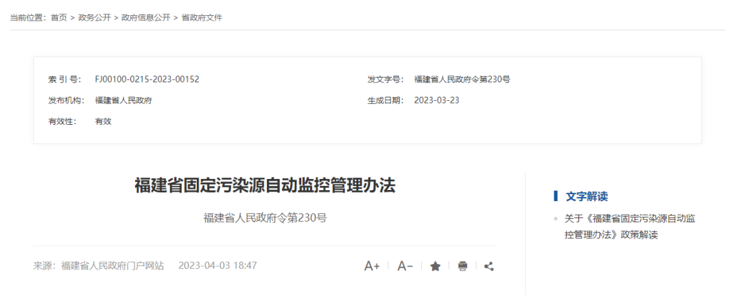 2023年3月15日,福建省政府第3次常務會議審議通過《福建省固定污染源自動監(jiān)控管理辦法(草案)》(以下簡稱《辦法》)。《辦法》自2023年7月1日起施行。其中,《辦法》第十五條規(guī)定,排污單位應當按照國家有關(guān)規(guī)定采取視頻監(jiān)控措施或者用電、用能、用水等過程監(jiān)控措施。視頻監(jiān)控范圍應當按照有關(guān)標準、規(guī)范覆蓋主要生產(chǎn)工序、治理工序、排放口、采樣點、監(jiān)控站房內(nèi)等,涉及國家機密、商業(yè)秘密和個人隱私的除外。用電、用能、用水等過程監(jiān)控范圍應當按照有關(guān)標準、規(guī)范覆蓋生產(chǎn)過程中產(chǎn)生和治理污染物的環(huán)節(jié)。