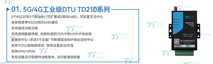5G/4G工業(yè)級DTU | TD210TD210 4G全網(wǎng)通工業(yè)DTU,支持各運(yùn)營商4G 3G 2G網(wǎng)絡(luò),核心模塊選自于國際知名品牌,傳輸更快、通信更穩(wěn)定、支持RS-232 RS-422 RS-485 TTL 模擬量 開關(guān)量,已廣泛運(yùn)用于環(huán)保、水利、電力、城市公共事業(yè)